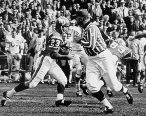 This undated photo provided by the Denver Broncos shows Austin William “Goose” Gonsoulin (23) running with the football. Gonsoulin, an “Original Bronco,” was acquired in a trade before Denver’s first season in 1960. The former AFL star is now battling cancer and recovering from open-heart surgery. Still, he watches his beloved Broncos with fervor. (AP Photo/Denver Broncos)
